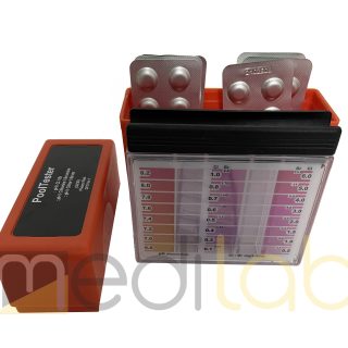 Leer másEl Kit Comparador Visual código XX01308, utiliza reactivos en Tableta de DPD1 de disolución rápida para determinar Cloro Residual Libre código 6903A y Rojo Fenol de disolución intermedia para determinar pH código 6915A. El kit de medición de Cloro y pH cumple con los valores obligatorios de 0.2, 0.5, 0.8, 1.0, 1.5, 2.0, 3.0 (ppm …