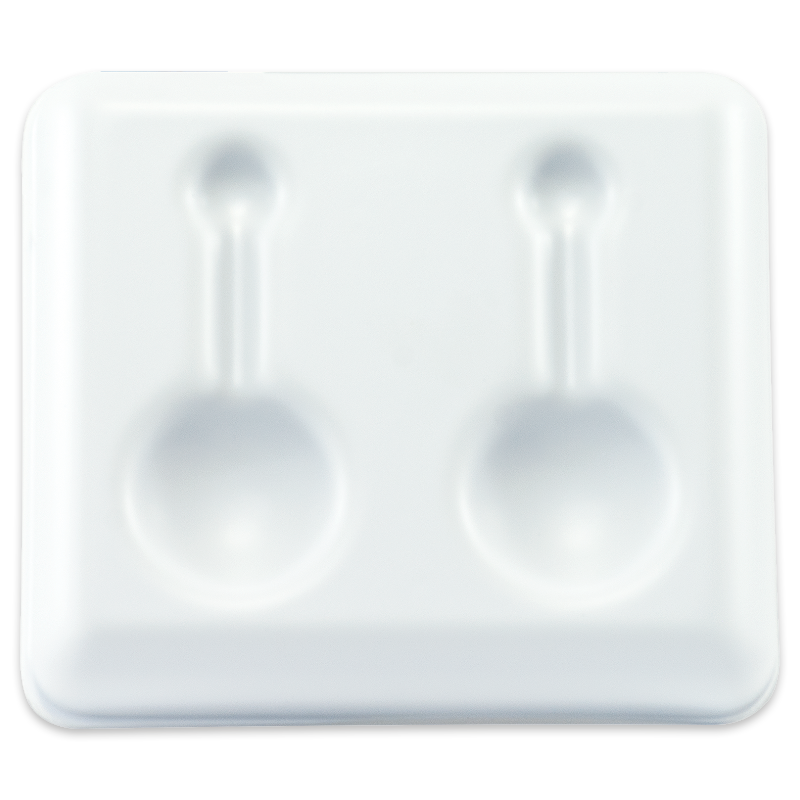 Plástico blanco. Dos pozos. 24mm x 8mm de profundidad. Canales de drenaje de 8 mm de ancho por 3 mm de profundidad llegan a pozos más pequeños de 10 mm de diámetro x 4 mm de profundidad. La placa mide 85mm x 75mm.