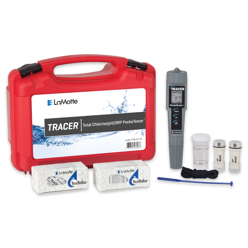 El TCl TRACER electrónico PockeTester™ mide los niveles totales de cloro con un rango de 0,00 a 9,99 ppm. Incluye un sensor intercambiable para lecturas de pH y ORP.