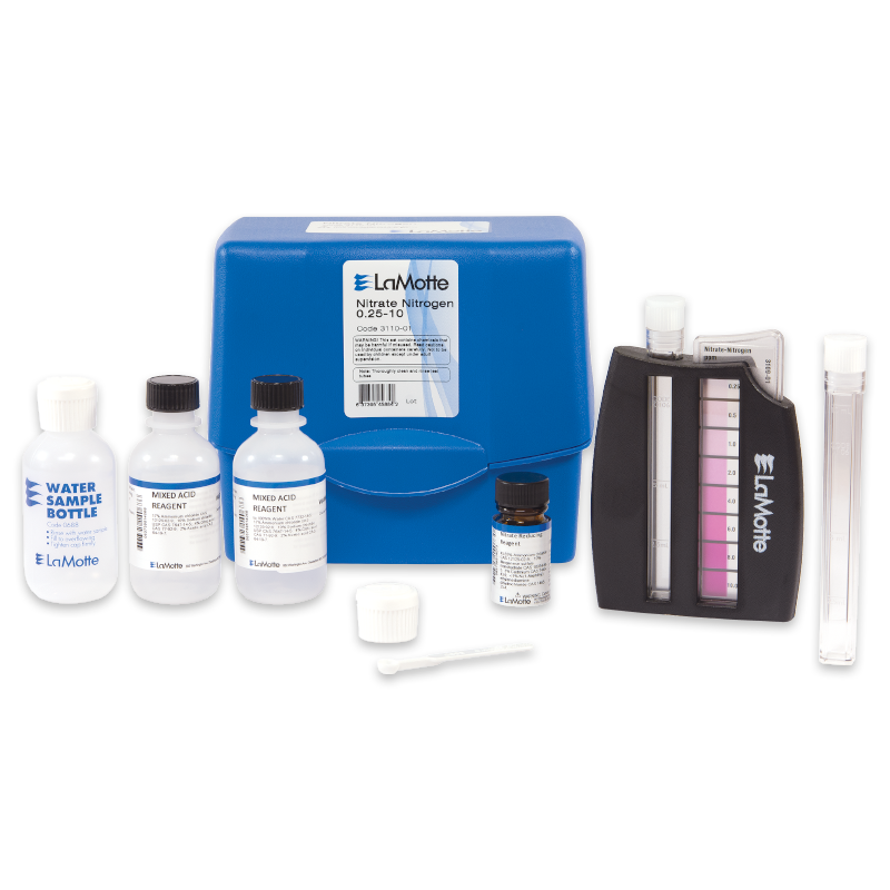 Este kit analiza los niveles de nitrato-nitrógeno mediante reducción de cadmio y se mide con el comparador Octa-Slide 2. El rango y la sensibilidad son 0,25, 0,5, 1,0, 2,0, 4,0, 6,0, 8,0, 10,0 ppm NO3-N.