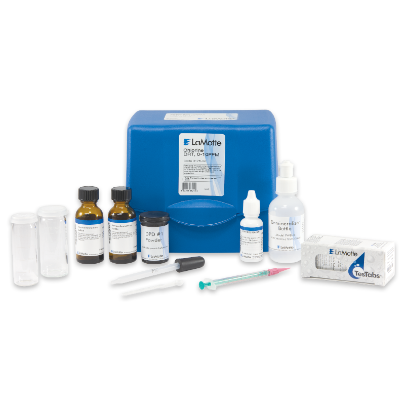 Este kit de prueba de cloro mide el cloro utilizando el método del titulador de lectura directa. El rango/sensibilidad es de 0-10 ppm/0,2 ppm Cl.