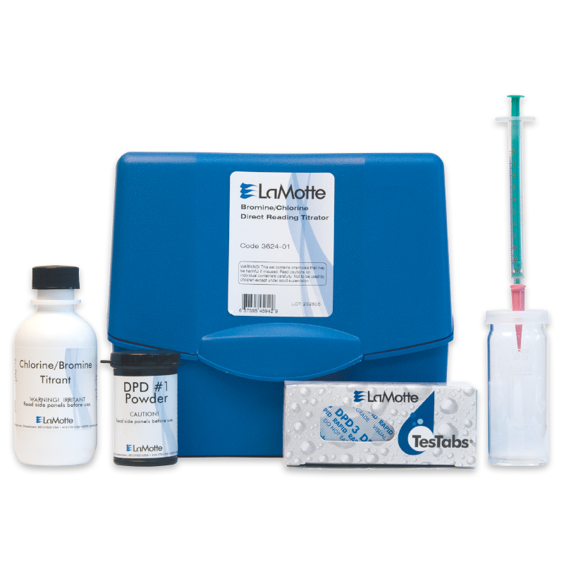 Este kit de prueba de cloro mide el cloro utilizando el método del titulador de lectura directa. El rango/sensibilidad es de 0-10 ppm/0,2 ppm Cl.