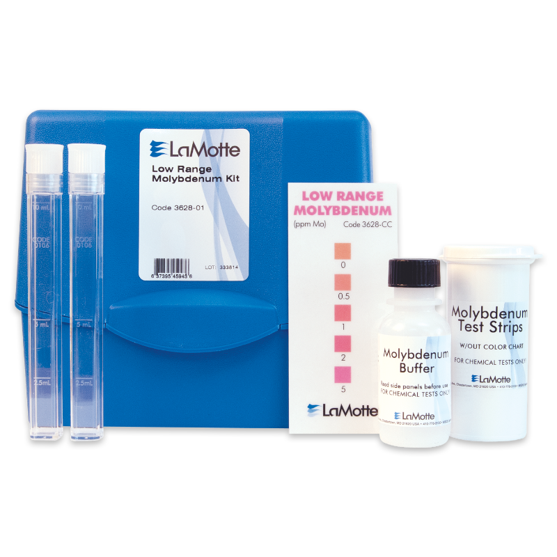 Este kit analiza el molibdeno usando el método de la tira reactiva. El rango/sensibilidad es 0, 0,5, 1, 2, 5 ppm.