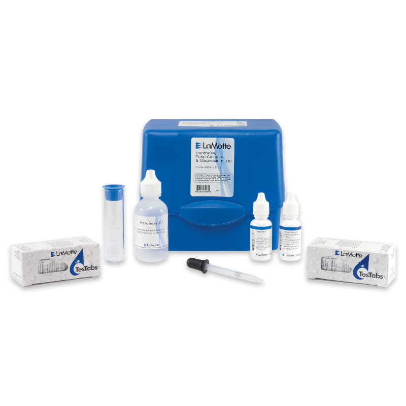 Este kit evalúa la dureza total, de calcio y magnesio utilizando el método de la botella cuentagotas. Todos los resultados son como CaCO3. El alcance/sensibilidad es 1 gota = 10 ppm o 1 gpg CaCO3.