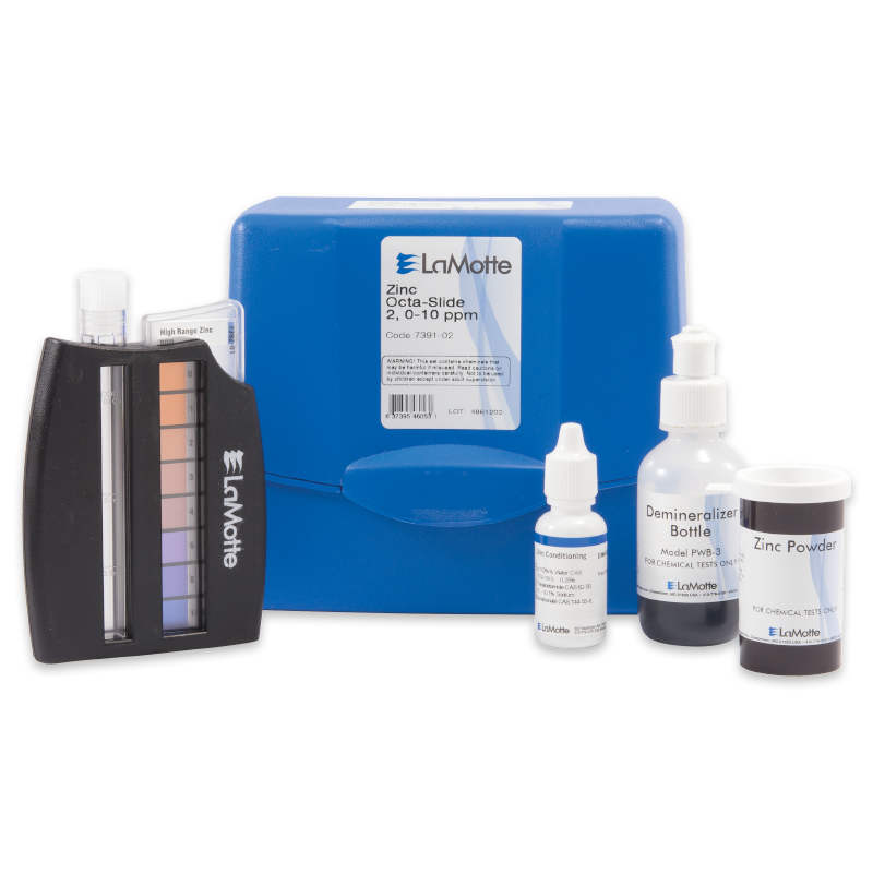 Este kit prueba el Zinc usando el comparador Octa-Slide 2. El rango y la sensibilidad son 0, 1, 2, 3, 4, 6, 8, 10 ppm Zn.